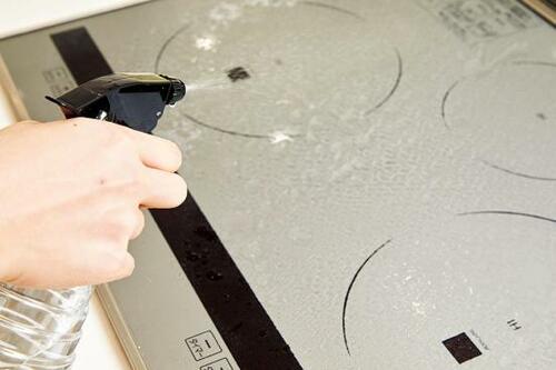 コンロ周りの汚れは、重曹スプレーが大活躍します。夕食の調理が終わったところで、汚れにシュッとひと吹き。