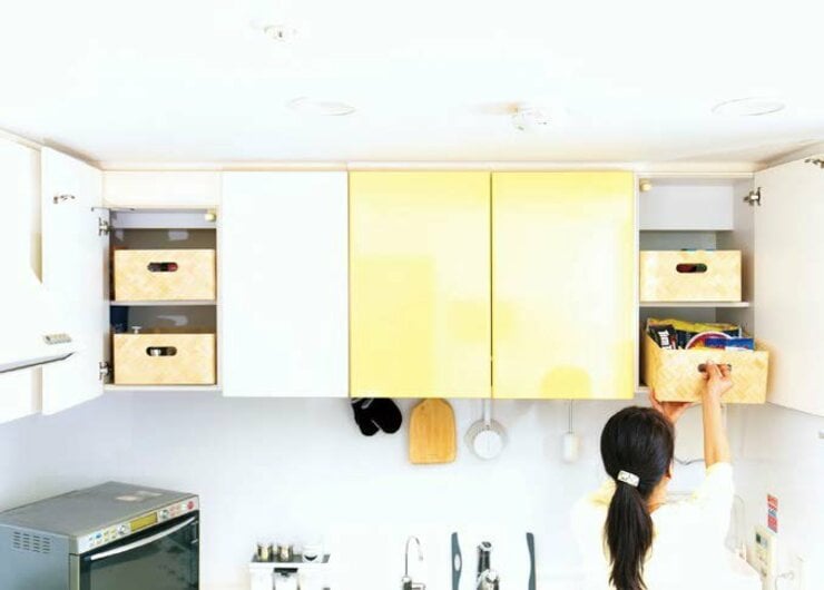 手が届きにくい吊り戸棚の上部は、普段使わないモノが押し込まれて死蔵品が溢れがちです。取っ手つきのカゴを使えば、高いところも奥まで収納できます。