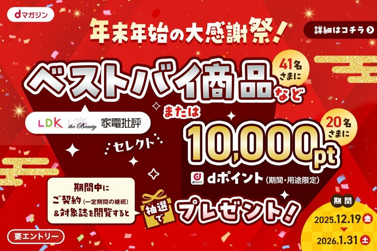 読者のみなさんへ感謝の気持ちを込めて、dマガジンとのプレゼントキャンペーンを実施中! キャンペーン期間は、2025年12月19日(金)10:00~2026年1月31日(土)23:59まで。